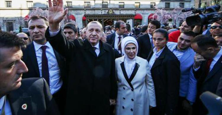 وتظاهر الأتراك الذين قدموا إلى واشنطن من الولايات المختلفة، أثناء انتقال الرئيس أردوغان من قاعدة "أندرس" الجوية، إلى فندق "ريغز" الذي سيقيم فيه مع عقيلته، حيث رحّبوا به، رافعين علَماً تركياً ضخماً.