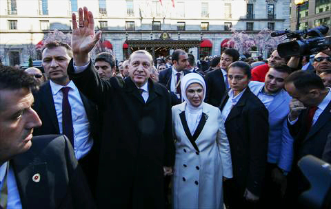 ولدى وصوله إلى باب الفندق، حيّا أردوغان وعقيلته، الجموع المحتشدة، الذين هتفوا بحياته.