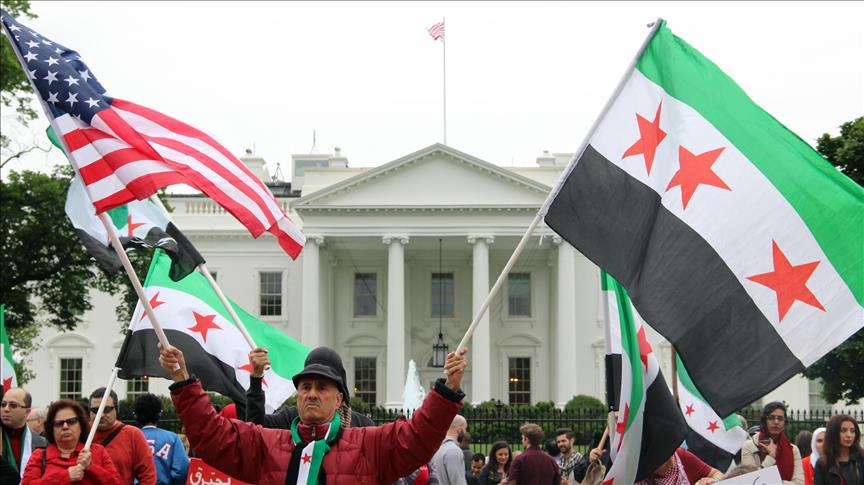 تظاهر العشرات أمام البيت الأبيض في العاصمة الأمريكية واشنطن، احتجاجًا على قصف النظام السوري وروسيا، مناطق سكنية في مدينة حلب.