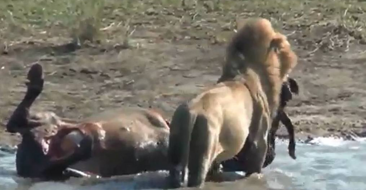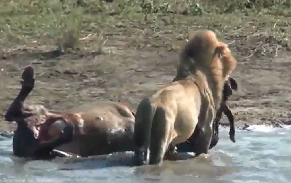 يبدو أن شهية هذا الأسد لم تتوقف عند التهام الجاموسة مع رفاقه الثلاثة، إلا أنه قرر أن يجري لها "عملية قيصرية"، بحسب تعبير الصحيفة البريطانية "ديلي ميل"، ليستخرج جنينها من بطنها ويأخذها بعيدا لإتمام وجبته الدسمة، في هذا الفيديو، المدهش والمثير للاشمئزاز، والذي التقط في حديقة كروغر الوطنية بحنوب إفريقيا.