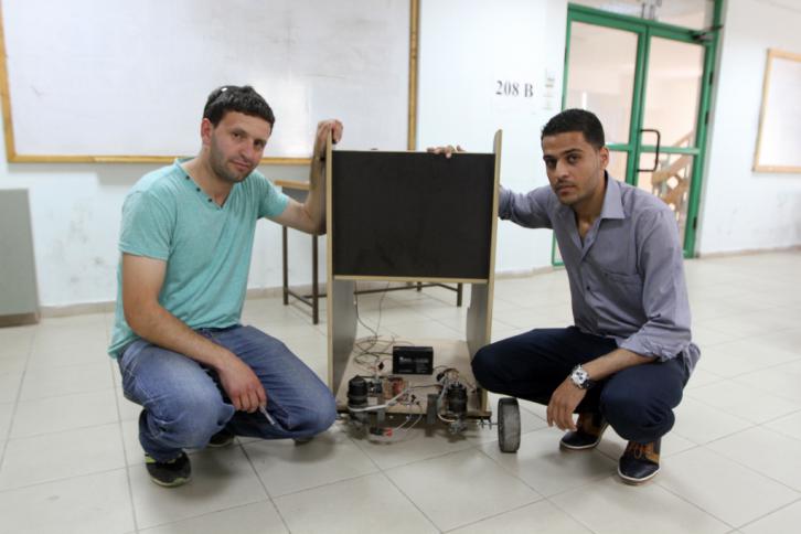 الكرسي المتحرك ابتكره الطلبة: أسامة البطمة، يوسف زبون، ونبيل أبو لبن، وتم تصميمه بالاعتماد على أدوات بدائية، حيث يقول الطالب أسامة البطمة في حديثه لـ "القدس" دوت كوم إن فكرة المشروع جاءت بهدف إيجاد آلية تمكّن الأشخاص الذين يعانون إعاقة شديدة من الحركة بسهولة ويسر دون مساعدة أحد.
