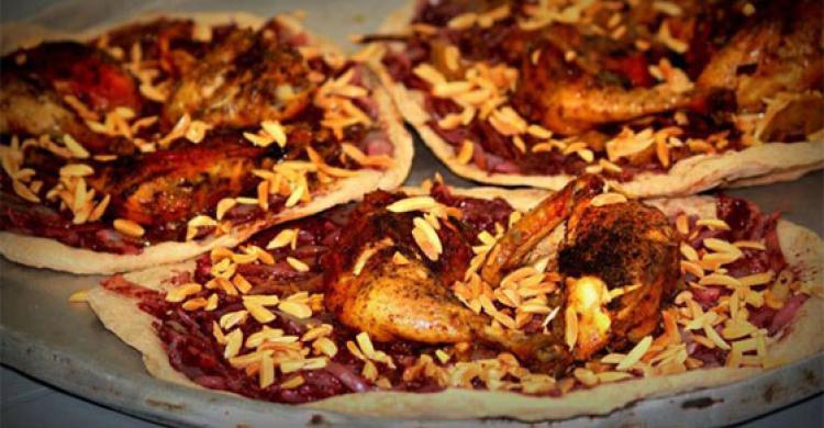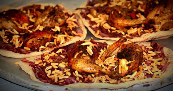 ٣. نضع أرغفة الخبز في صينية الفرن نضع بصل على كل رغيف ونفرده ليغطي الرغيف ندخل الصينيه الفرن ليتحمرقليلا طبعا ندخل الارغفه على دفعات ثم نصف الارغفه في صينيه فوق بعض نضع الدجاج والمكسرات ويقدم ساخن