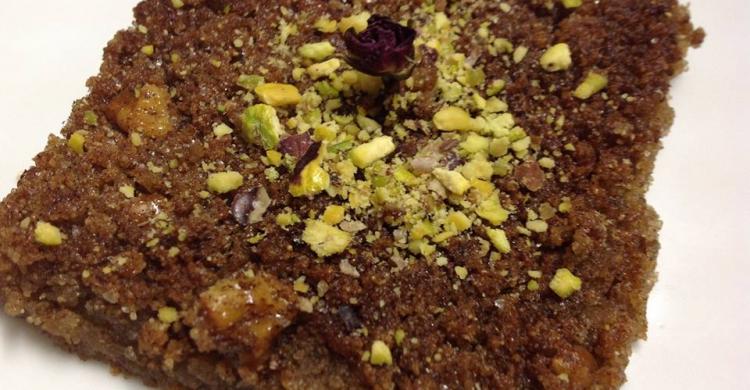 رابعاً: نصب خليط المكونات السابقة في صينية، ثم نضع فوقها مزيج الجوز القرفة، ثم نصب باقي الخليط فوق الجوز.