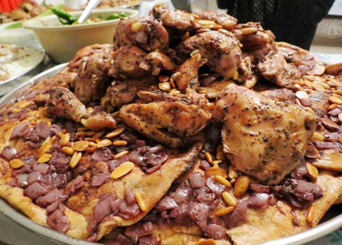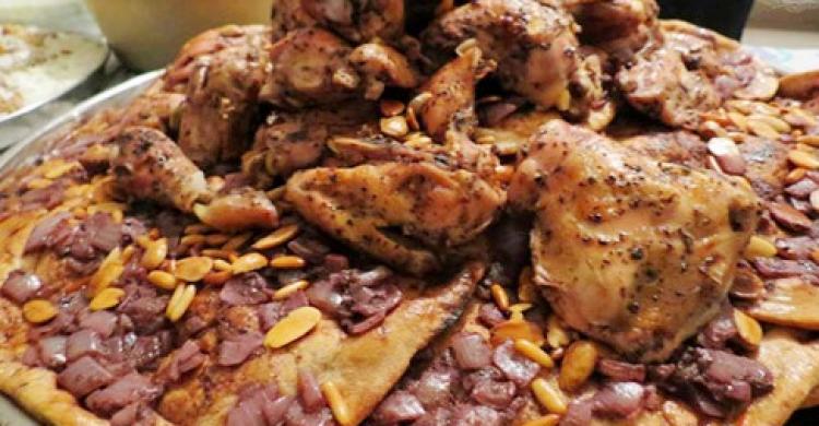 - دجاج مقطع خبز طابون ( شراك ) سماق ملح و فلفل أسمر 7 حبات بصل زبيب زيت زيتون لوز مقشر ليمون صلصة و ثوم