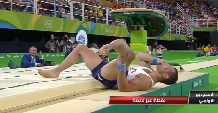 وسقط لاعب الجمباز الفرنسي بشكل خاطئ, مما تسبب بكسر في قصبة قدمه، في لقطة صعبة للغاية.
