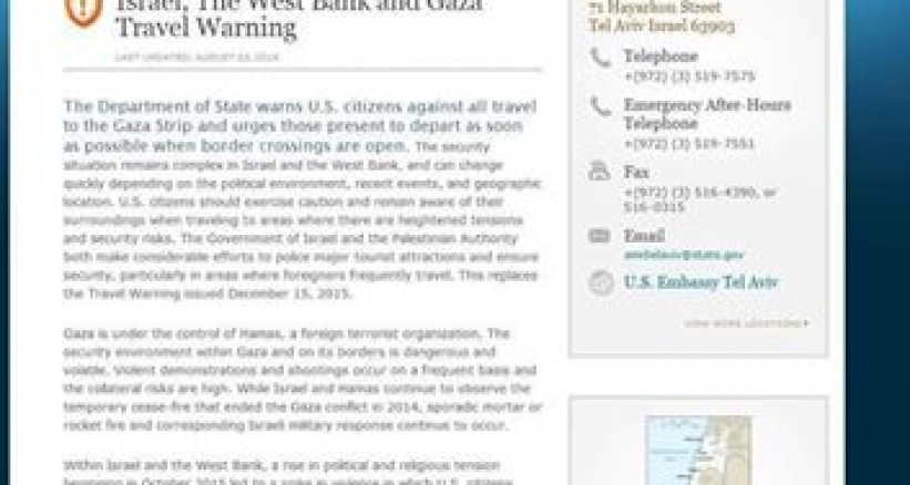 أصدرت وزارة الخارجية الأميركية تحذيراً قوي اللهجة لرعاياها  بعدم السفر إلى قطاع غزة ، وتحث فيه الموجودين هناك على الرحيل في أقرب فرصة ممكنة لدى فتح المعابر .