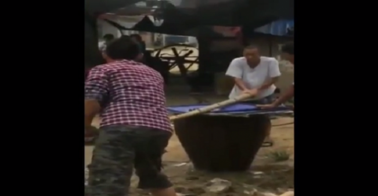 وبعد دقيقتين من رمي الكلب في القدر تم رفع الغطاء لآخر مرة، وقام أحد الرجال بتحريك الحيوان الميت بعصي خشبية. حيث استخدمها لرفع جثة الكلب من العنق ثم قام بوضع الجثة الهامدة على الأرض.