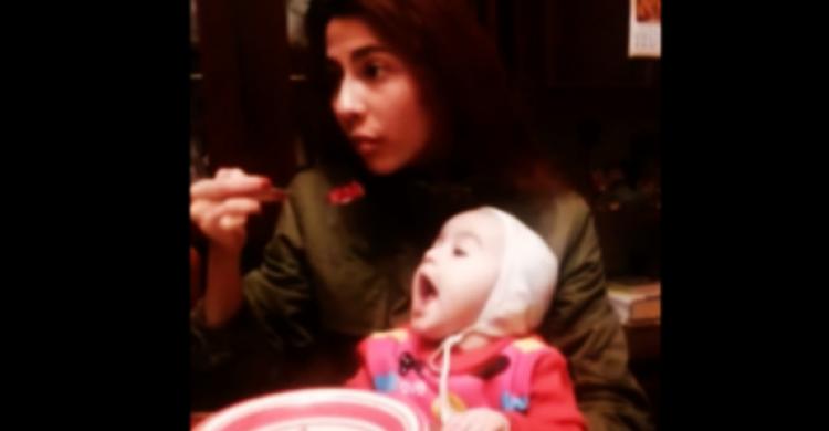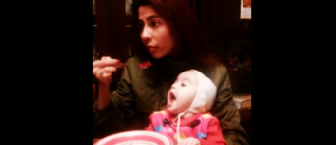 وأظهر المقطع الأم وهي تجلس حاملة رضيعتها فوق ساقيها وتجلسان على طاولة الطعام، وأمامهما طبق فيه حبات ثمرة الرمان الشهية، وعلى ما يبدو أن السيدة كانت منشغلة في مشاهدة التلفاز.