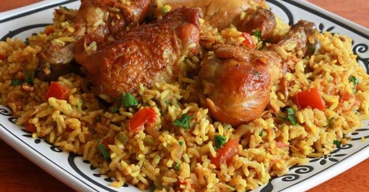 ٦. نضع الدجاج في الفرن ونحمره قليلاً ثم نسكب الارز ونضع الدجاج فوقه وتقدم الكبسة إلى جانب سلطة او صلصة الدقوس.