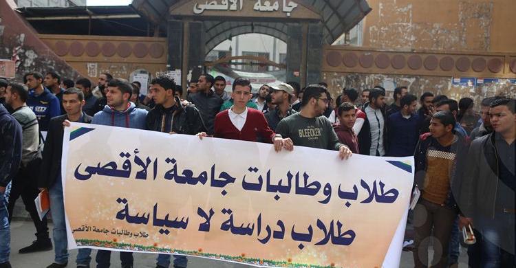 نظم طلاب جامعة الاقصى في غزة، اليوم الأربعاء، وقفة احتجاجية ضد زج الجامعة في المناكفات السياسية، التي تهدد مستقبل الطلبة بالحصول على شهادات معترف بها من وزارة التربية والتعليم العالي.
