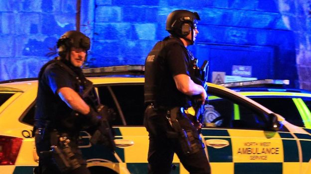 وبلغ الشرطة طلبات استدعاء بعد أنباء عن انفجار في نحو الساعة 22:35 بالتوقيت المحلي (بتوقيت 21:35غرنيتش) عقب حفل للمغنية الأمريكية أريانا غراندي في قاعة "مانشستر ارينا".