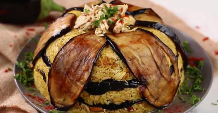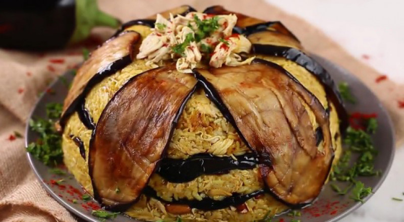 11- زيّني المقلوبة من الخارج بالمزيد من شرائح الباذنجان مع شرائح الدجاج.