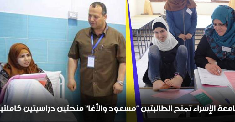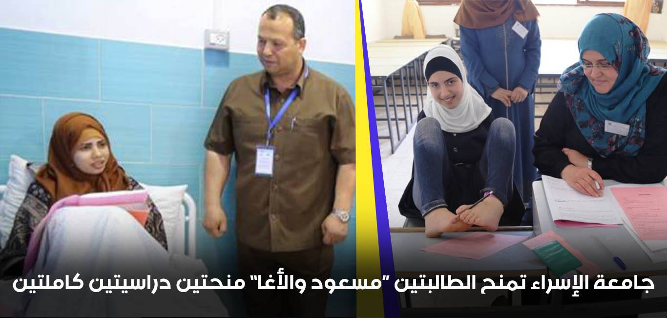 قدَّمت جامعة الإسراء في غزة منحتين دراسيتين كاملتين للطالبتين "آية وائل مسعود" التي تعاني من إعاقة عدم وجود ذراعين لها منذ الولادة وتقدم امتحانات الثانوية العامة في مدرسة رامز فاخرة بمدينة غزة، والطالبة "وردة علي الأغا" من خانيونس والتي تعاني من مرض السرطان وتقدم امتحانات الثانوية العامة على سرير المستشفى.