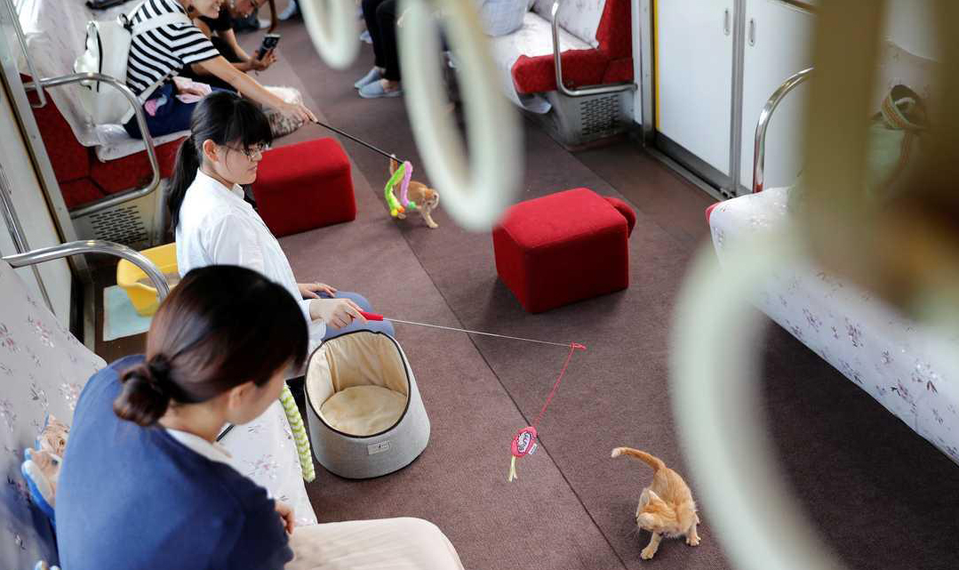 وفي تجربة هي الأولى من نوعها، كان مواء القطط في استقبال ركاب القطار بمدينة أوجاكي بوسط اليابان. وداعب بعض الركاب القطط بينما كان آخرون يتناولون طعام الغذاء.