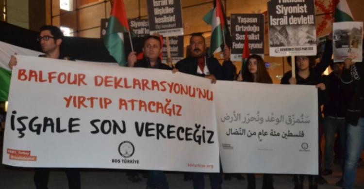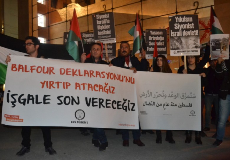 نظم تجمع حركة مقاطعة "إسرائيل" "BDS "، مساء أمس الخميس، وقفة احتجاجية بمنطقة تقسيم في إسطنبول، بحضور عدد من أبناء فلسطين والجاليات العربية ومتضامنين أتراك، وذلك في الذكرى المئوية لوعد "بلفور" المشؤوم.