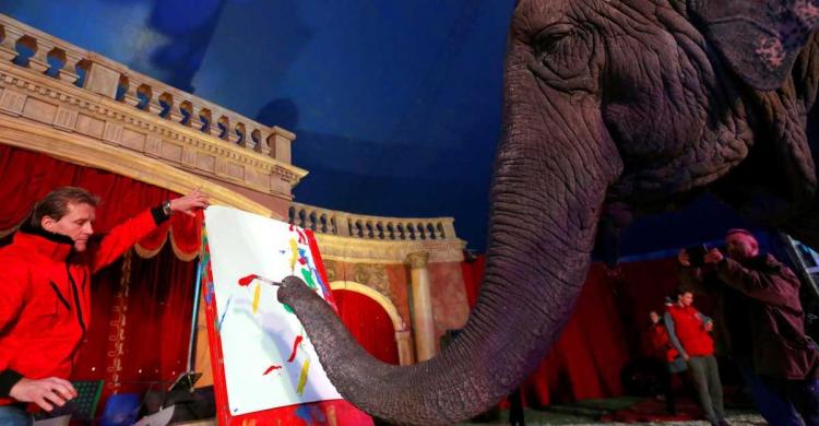 باع سيرك مجري متجول في مزاد، أمس السبت، لوحات صنعتها أنثى فيل هندية تحب الإمساك بالفرشاة وتجيد الرسم بها.