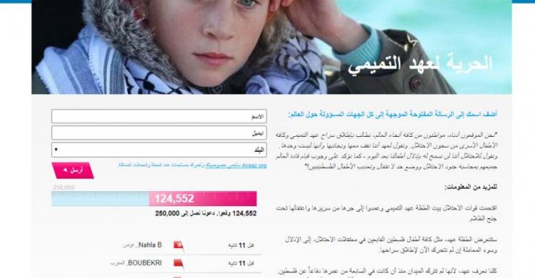 دشن نشطاء عبر موقع العرائض والحملات العالمي "آفاز"، حملة لجمع توقيعات إلكترونية تطالب الاحتلال الإسرائيلي بإطلاق سراح الطفلة عهد التميمي التي مددت اعتقالها.