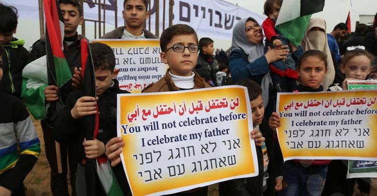 وعلق المتظاهرون، في المكان المقابل لمنطقة السياج الفاصل على الحدود الشرقية، لافتات كبيرة باللغة العبرية، تطالب بإطلاق سراح الأسرى الفلسطينيين.