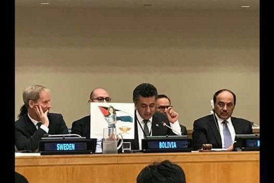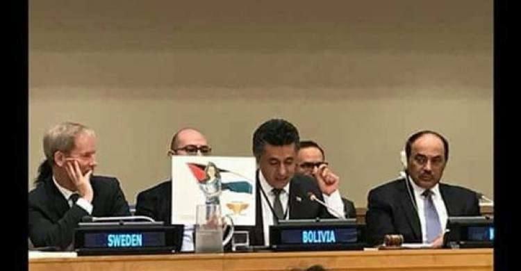رفع سفير بوليفيا صورة الطفلة الأسيرة في سجون الاحتلال، عهد التميمي، خلال اجتماع لأعضاء مجلس الأمن، كان رسمها الفنان جيم فتس باتريك في وقت سابق.