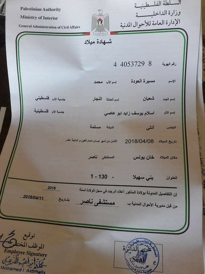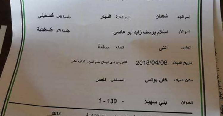 وقال محمد النجار والد الطفلة لوكالة الأناضول، اليوم الأربعاء:" أطلقت اسم (مسيرة العودة) على مولودتي، التي ولدت في الثامن من الشهر الحالي، بمستشفى التحرير في خان يونس، داعمًا لاستمرار مسيرات العودة".