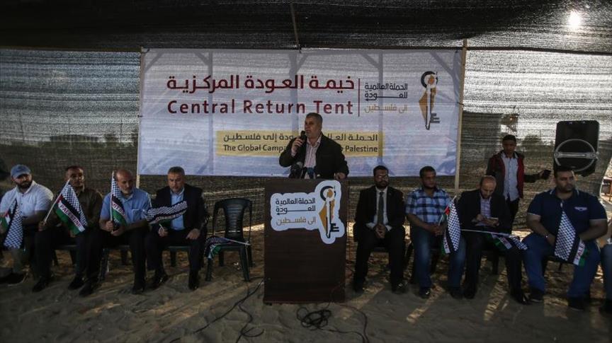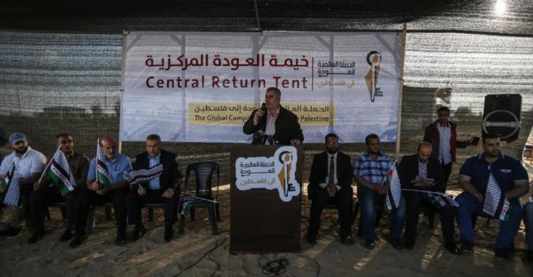 وقال القيادي في حركة المقاومة الإسلامية حماس، إسماعيل رضوان، في كلمة له خلال الافتتاح: "في هذه الأثناء التي نفتتح فيها الخيمة المركزية للتأكيد على حق العودة، هناك افتتاح ٥٠ خيمة مماثلة حول العالم، لدعم القضية الفلسطينية".