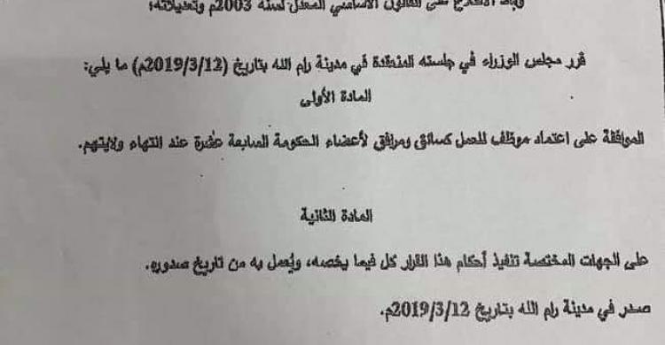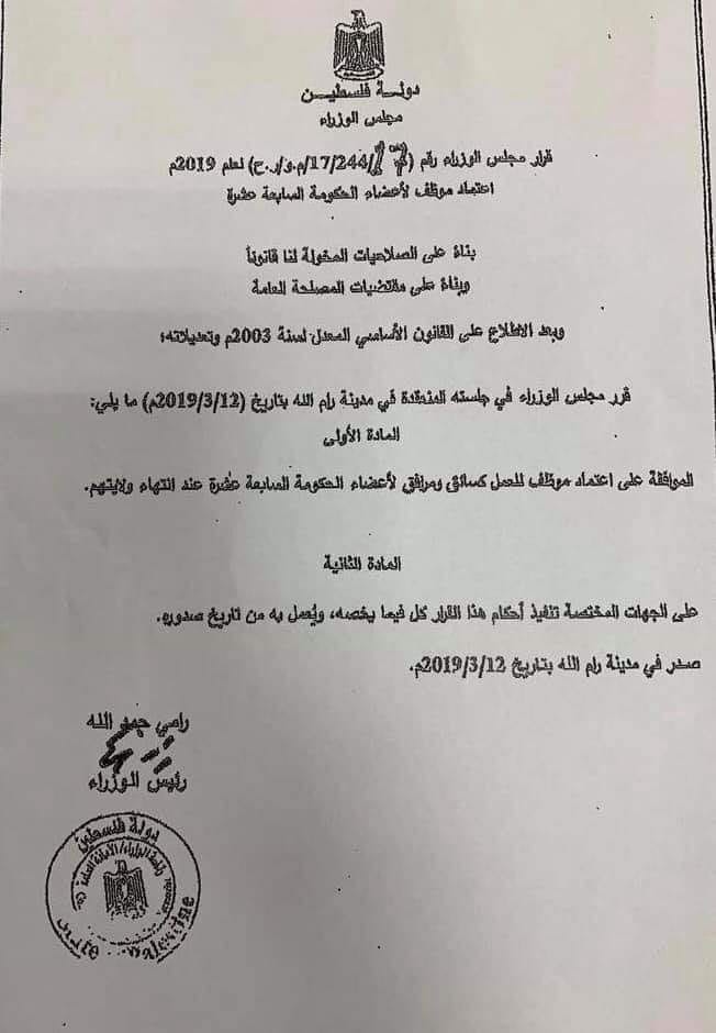 وفي تفاصيل الكتاب: "بعد الاطلاع على القانون الأساسي المعدل لسنة 2003 وتعديلاته قرر مجلس الوزراء في جلسته المنعقدة برام الله بتاريخ 12-3-2019 الموافقة على اعتماد موظف للعمل كسائق ومرافق لأعضاء الحكومة السابعة عشرة عند انتهاء ولايتهم، وعلى الجهات المختصة تنفيذ أحكام هذا القرار كل فيما يخصه، ويعمل به من تاريخ صدوره".