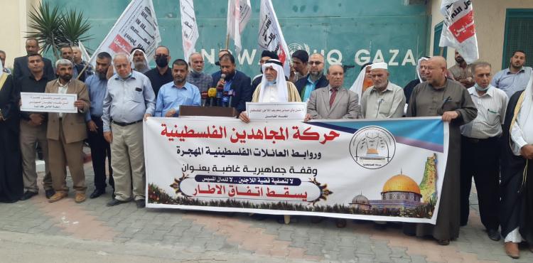 خلال وقفة جماهيرية غاضبة بالصور "المجاهدين" والعائلات الفلسطينية تؤكد رفضها القاطع لاتفاق الإطار بين الإدارة الامريكية والأونروا. 21 أكتوبر 2021