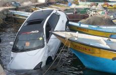 (بالفيديو) إنقاذ 5 أشخاص عقب سقوط سيارتهم بحوض ميناء غزة