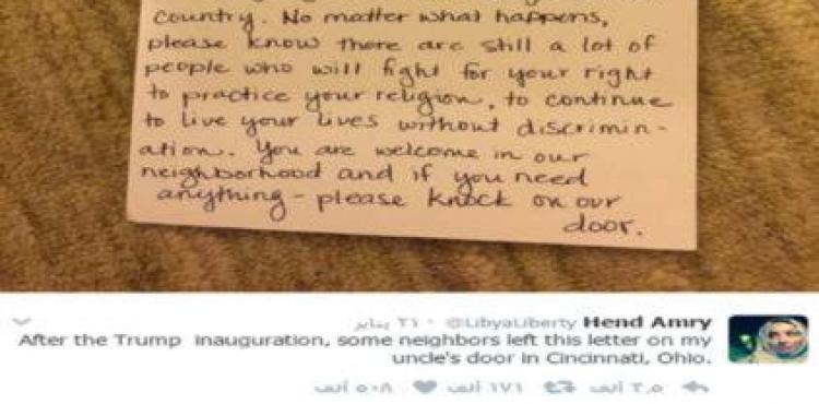 جيران يتركون رسالة على باب بيت مسلمين في أمريكا